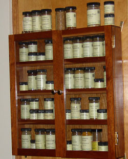 This morning, 6:30? Re-alphabatized my spice cabinet. This was a wedding gift from Hubby’s best man – he made it in cherry. This is the same man we did the beer labels for. One of the beer names we created was “Wood Studs Local 652.” He also gave us a gift certificate to Milwaukee-based spice store Penzey’s. They rock.