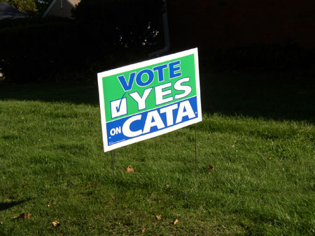 Here’s our lawn sign for the Capital Area Transportation Authority, Lansing’s bus service. In the midst of this energy crisis, CATA’s operating millage failed this fall. They’re going up again in November. I mean, their operating millage failed. This would mean, among other things, serious cutbacks (evening and weekend service) for SpecTran, the service for people with disabilities. This would really cut back on Hubby’s transportation independence. Go CATA millage!