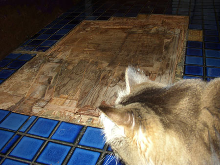 We are now experiencing what can be defined as “scope creep.” I mean… as long as we’re installing new tile why not paint while all the appliances are pulled out of the kitchen? As long as the floor is coming up why not install gas as we’ll want the next stove to be gas (and you have to cut through whatever floor is there to install it)? As long as we’re doing all that why not replace the 25 year old countertops? And if we’re replacing the countertops we’ll need to do the backsplash. First choice: Plum Copper Glass. It’s a plum heue. It’s copper. It’s embedded in glass. It is so hot. Unfortunately, it also costs a fortune so I’ll be having “cutouts” where they sneak in little bits here and there.