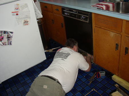 The top photo is Scott taking out the dishwasher. The new one gets installed today but we took the old one out to make sure there wasn’t any water damage on the floor beneath it. His T-shirt reads “Drive it like you stole it.”
