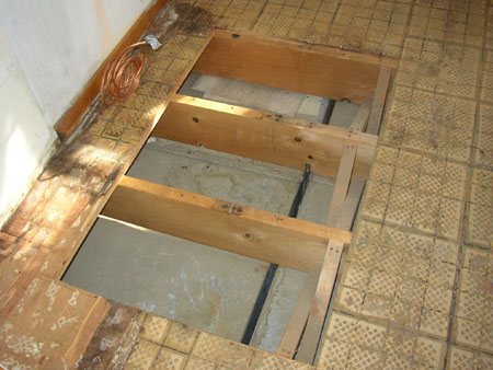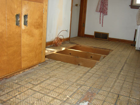 Now with the replacement wood and a sea of removed blue tiles I can see what the kitchen would have looked like with a neutral-colored floor. BORING! My honey-colored cabinets simply cannot support a neutral floor. Several people told me that I wouldn’t want visitors looking at my floor. I thought, You haven’t see my 20-year old linoleum counter tops. The floor is exactly where I want people looking! Besides, I have all those retro jamming 1950’s birch cupboards.