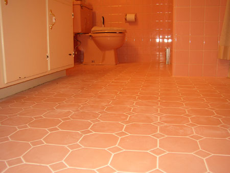 We had three tiles that had come up on the “Venetian Pink” floor so as long as we had the floor being tiled I asked the rocking jamming totally awesome tile guy Mario to fix them as he had all the stuff right there. He said he’d do it gratis. I mean, three tiles? Not much of a job for him. He fixed the tiles and then started to re-grout just that area. I realized the bathroom was going to look weird with just the one area with bright white grout and the rest with old grout so I asked him to do the whole floor which he did with good grace. An hour later and it looks like a new floor. I feel kind of guilty to have gotten a whole room of free work and I offered to pay him on the side for the work but he refused.