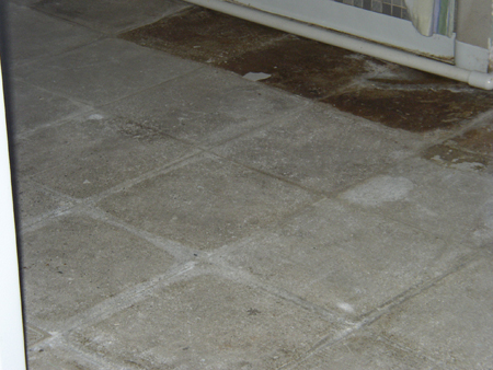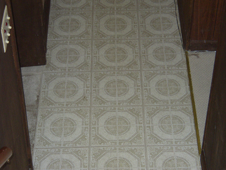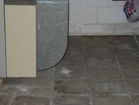 Here’s the first photo – the current basement tile that we are leaving down in the hall and on the stairs. It’s in fine shape and I have no “tile ego” that would draw me to replace it for no reason. The tile in the laundry room, however, was coming up. It’s 12 X 12 feel and stick squares that match the hall – maybe from the 50s? maybe from the 70s? In any case, we had a basement glass block window that was broken when we moved into the house and it had been causing the famous water damage that seems to be such a feature of our home. It ran over the basement tiles on its way to the drain and after some years (NO COMMENT NO COMMENT NO COMMENT on the home care of the previous owners, particularly in the last 3 years they owned it and wanted to sell it) the tiles have started popping up.