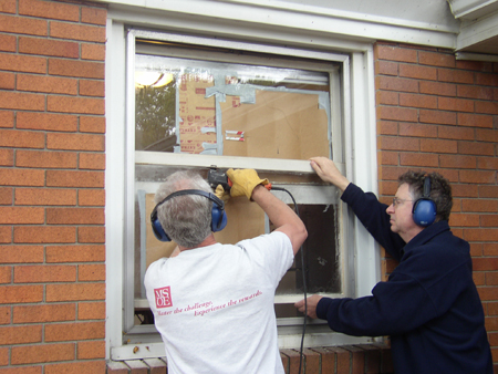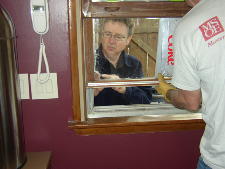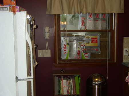 This year while he was cooking his friends put in a new window. As you can see, we were looking pretty ghetto there. We cracked the windows trying to scrape off old caulk. Then the cracks grew. Finally we had to reinforce the windows. In come the reinforcements. Hubby was darned determined that he and I would do this alone, together, ourselves. I balked and balked.