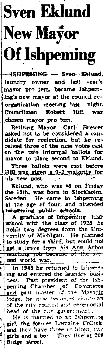 Jan’s father was Sven Adolph Eklund (b. 13 Aug 1908 d. Sept 1992). He was a local Ishpeming businessman who owned a laundry specializing in cleaning uniforms for local miners. He was also a city council member and on 16 Aug 1954, he was elected mayor.