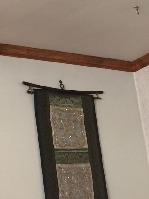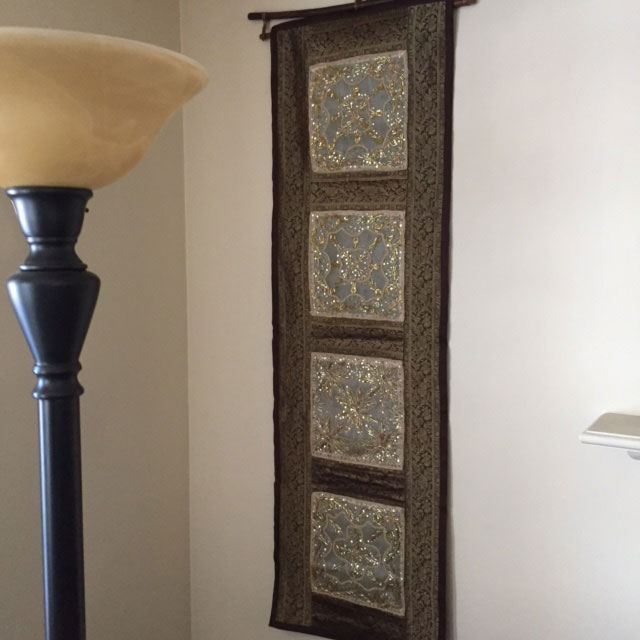 “The fireplace” got the most votes and my sister-in-law Lovely and I did some hard-core Ann Arbor shopping for wall hangings to accent it. We struck gold at Orchid Lane and Ten Thousand Villages. Madame B and I did a run back to town last week to get the hangers themselves. I also simplified the mantle decorations while adding a colorful splash of picture frames.