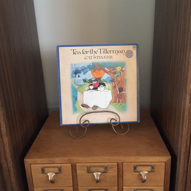 Atop the card catalog is an experiment for me, I’m decorating with album jacket art. I’m using original Cat Stevens vinyl albums in a book stand to accent the room.