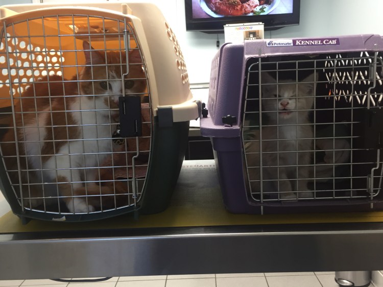 It’s been four days and we were hoping to introduce the cats tonight but an afternoon call back from the vet put the brakes on that. On top of a mild eye infection, Scout has a double dose of parasites: both roundworm and giardia. They’re contagious to other cats as well as people. He’ll need thrice-medication dosing at irregular intervals for the next seven days and he won’t have a clean bill of health for three weeks. After that we can either bleach his litter box twice over (oh, sign me up!) or just toss it. You can guess which way we’re going.
