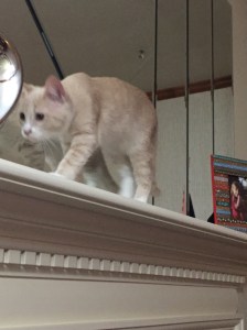 Scout has now taken to getting up onto the mantel and going on a kitten rampage: knocking off knickknacks, chewing on picture frames, walking back and forth until all of Bethesda’s memory pieces (her paw print in clay, the cards we received) are scattered on the floor.