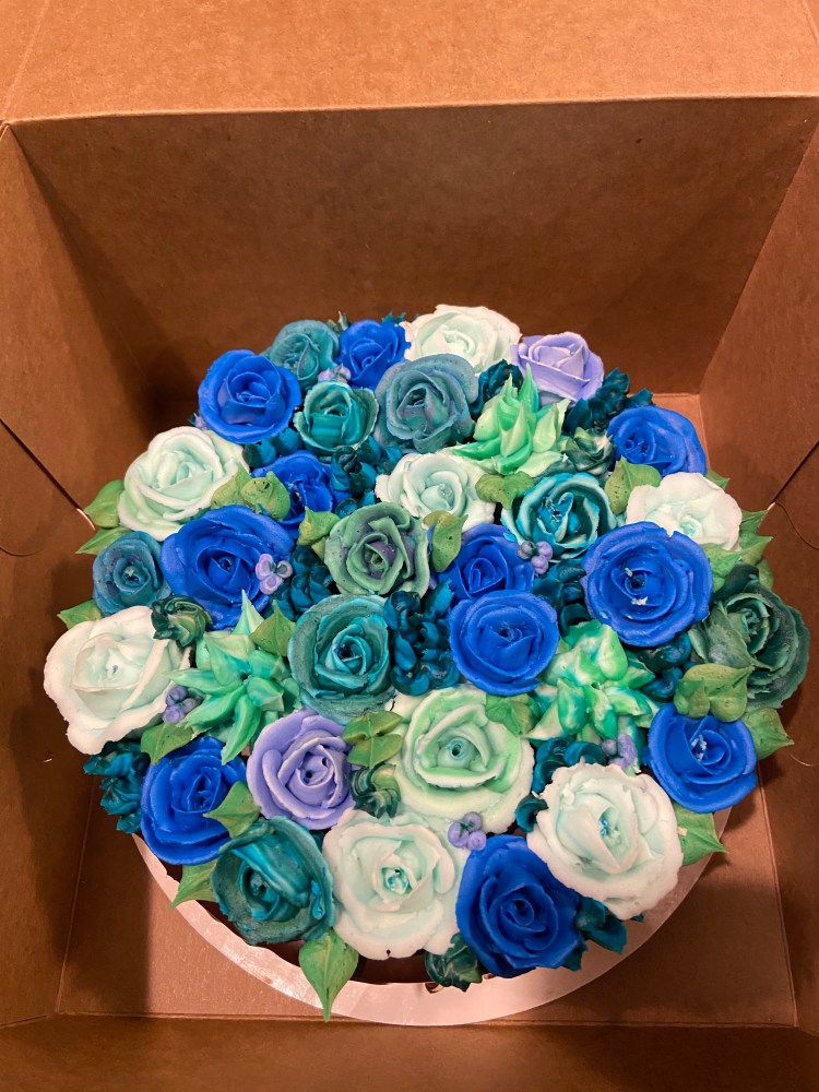“Absolutely, ma’am. We can cover the entire top for you. What color flowers would you like?” I froze. The pressure! She started helping, “We could do pink and purple, or yellow, or blue and green.”