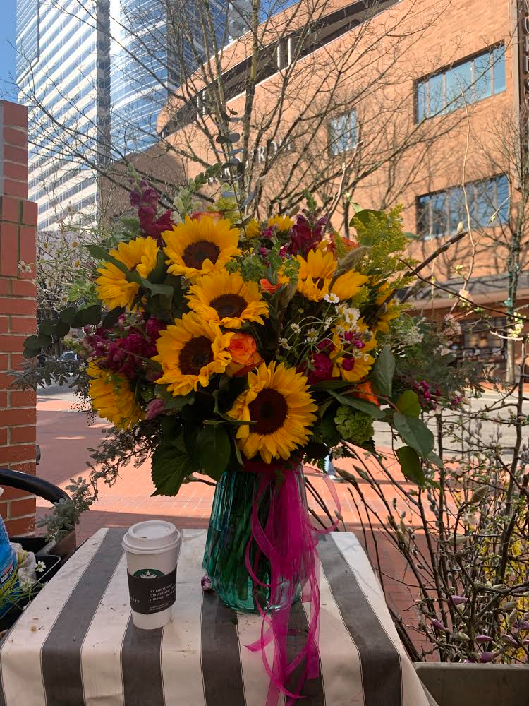 The site said, “You should trust me. I’m good at this.” So I did! I said, “Go with a base of sunflowers, and work your magic.”
