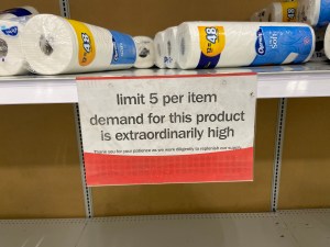 On Saturday morning I ventured to Fred Meyer (now owned by Kroger but previously owned/managed locally) arriving around 8:30a; they open at 6:00a. There was no toilet paper, most baby wipes were gone, and no hand sanitizer or sanitizing wipes. I overheard someone ask an employee about the toilet paper and they were told they “ran out about two hours ago”, which would have been about 30 minutes after they opened.